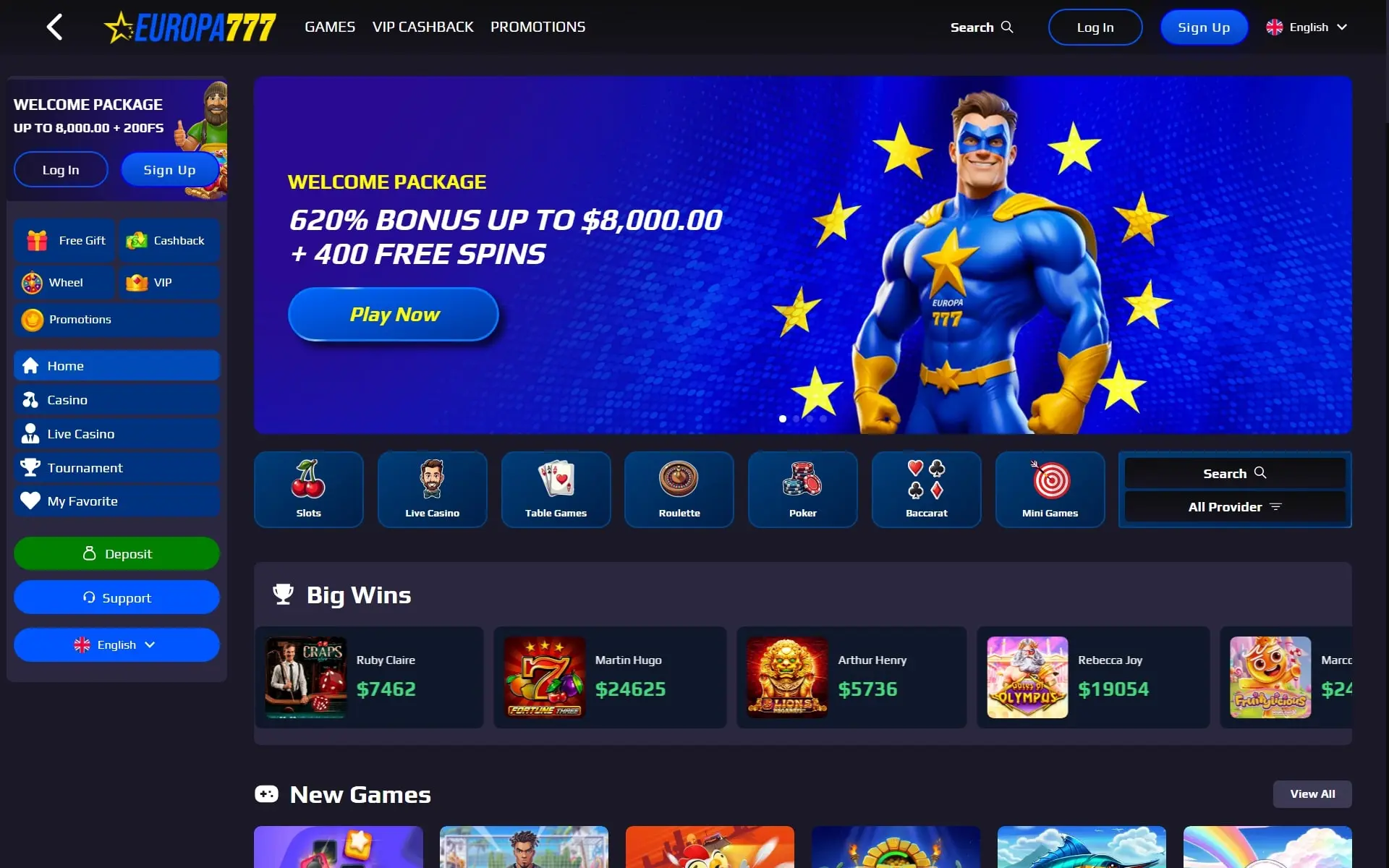 Ready to play at Europa777 Casino? Join now and unlock a welcome package of up to $8,000 plus free spins, along with daily rewards and VIP perks in just a few clicks.