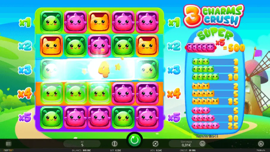 3 Charms Crush slot stands on Cartoon thematic, but nevertheless you will be able to find aspects from Cats, Fantasy themes too. Undoubtedly, if you enjoy at least one of latter slot machine thematics – time spent on discovering all features of this slot machine will be completely wonderful.