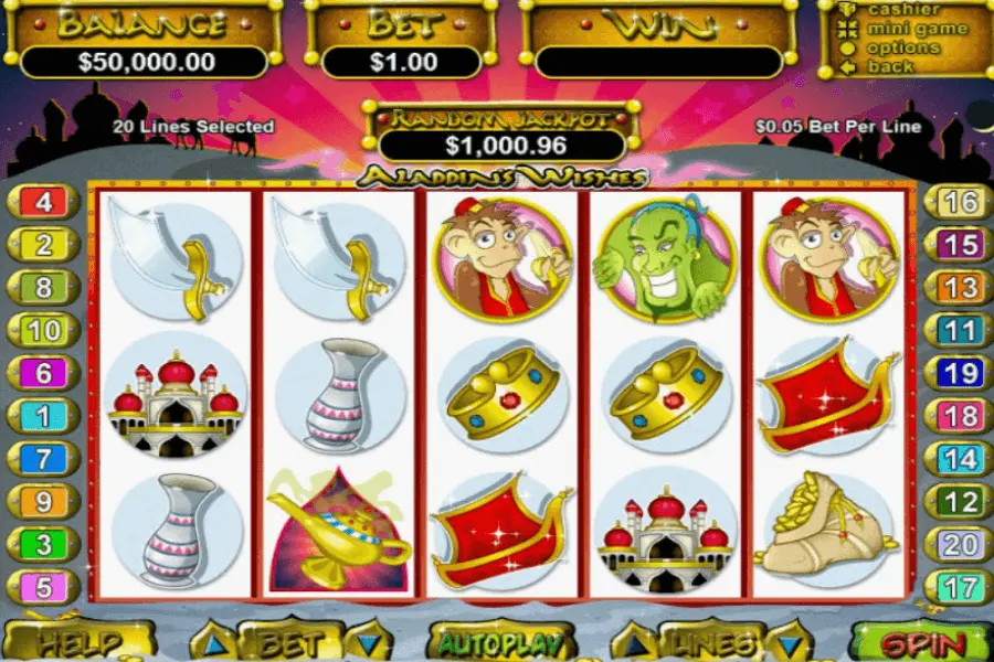 Aladdin’s Wishes slot has 5 reels as well as 20 pay lines progressive slot, created in 2016. Certainly, casino game can be labeled as new and modern.