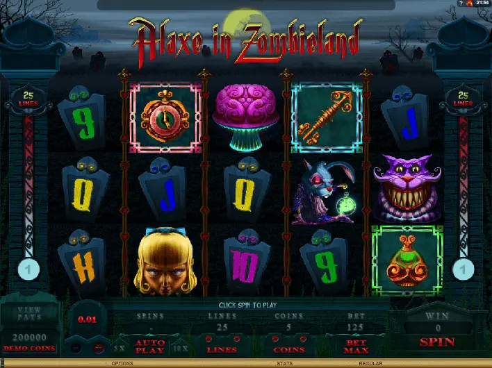 Alaxe in Zombieland slot is based on Fairy Tale theme, but you will easily notice elements from Fantasy, Mystery, Halloween, Cartoon, Adventure thematics as well. Undoubtedly, if you enjoy some of latter online slot machine thematics – moments of discovering all features of this slot machine will be really famous.
