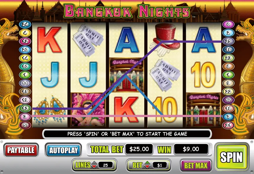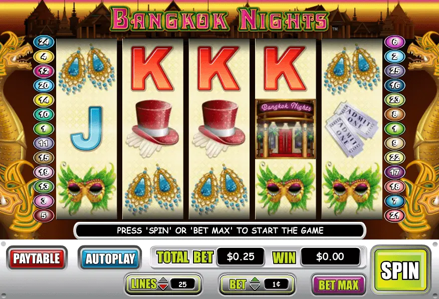 Bangkok Nights slot is a 5 reels and 25 paylines video slot machine, made in 2009. Surely, online game should be named as old and very trusted.
