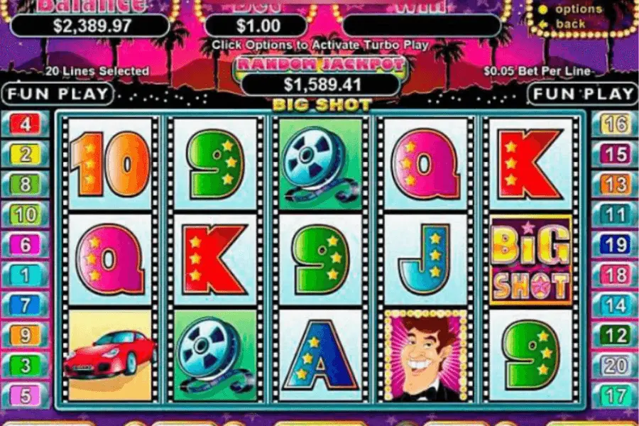 Big Shot slot depends on Movie thematic, but nevertheless you will easily see elements which belongs to TV, Cars, Party thematics as well. Surely, if you take delight in at least one of previously mentioned slot themes – time spent on discovering all features of this slot machine will be completely outstanding.