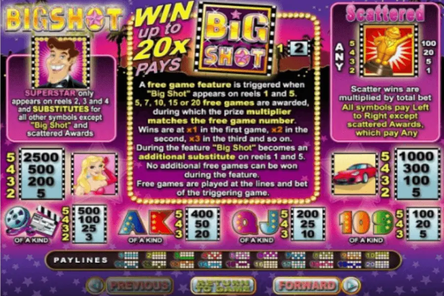 Big Shot slot has 5-reel and 20 pay lines progressive slot, created in 2019. Clearly, casino game must be labeled as new but reliable.