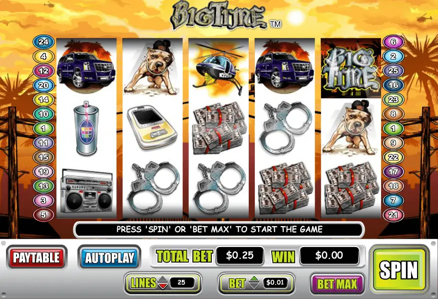 Big Time slot stands on Wild topic, but nevertheless you will be able to notice details of Adventure, Cars, Mafia topics too. Undoubtedly, if you like these latter slot machine thematics – experience you get from discovering all features of this online slot will be completely outstanding.