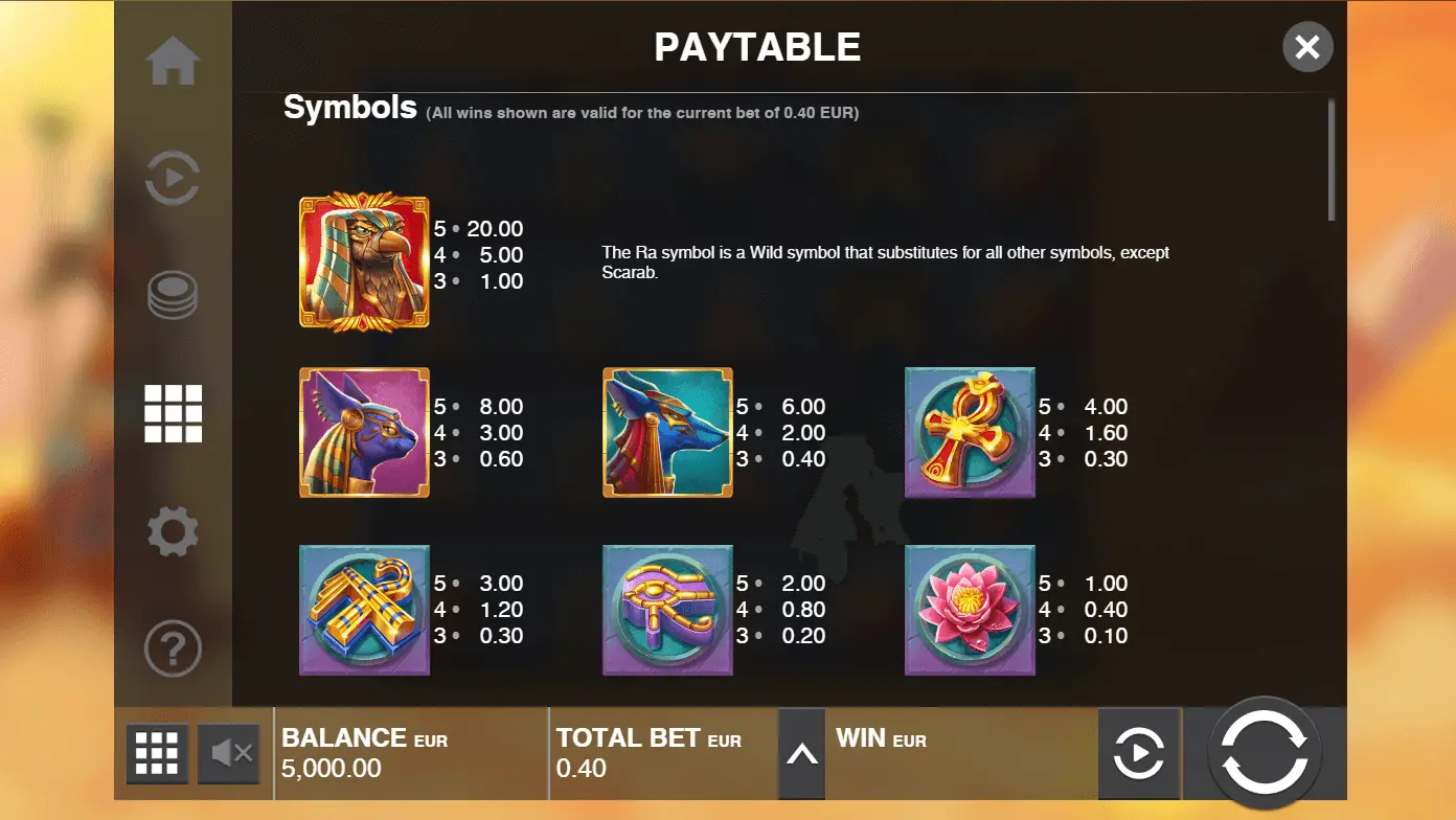Blaze Of Ra slot depends on Ancient thematic, but you will easily meet components which belongs to Egypt, Pharaoh, Adventure topics as well. Definitely, if you love these latter slot machine thematics – experience you get from discovering all features of this slot will be simply impressive.