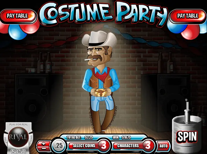 Costume Party slot game from Rival Gaming came out in 2016 and gets 3 reels and 3 pay lines at an RTP of 94.5%. The minimum coin size is 0.01 and the maximum is 5 coins. Bet a minimum of 1 and maximum of 3 per spin to reach the jackpot of 5400 coins.