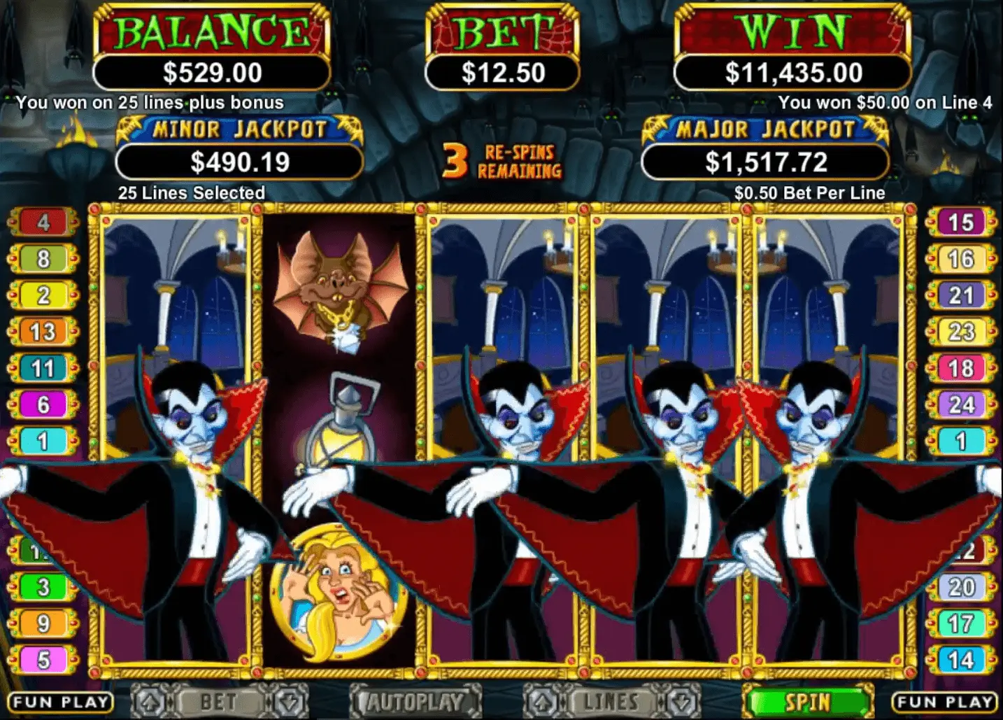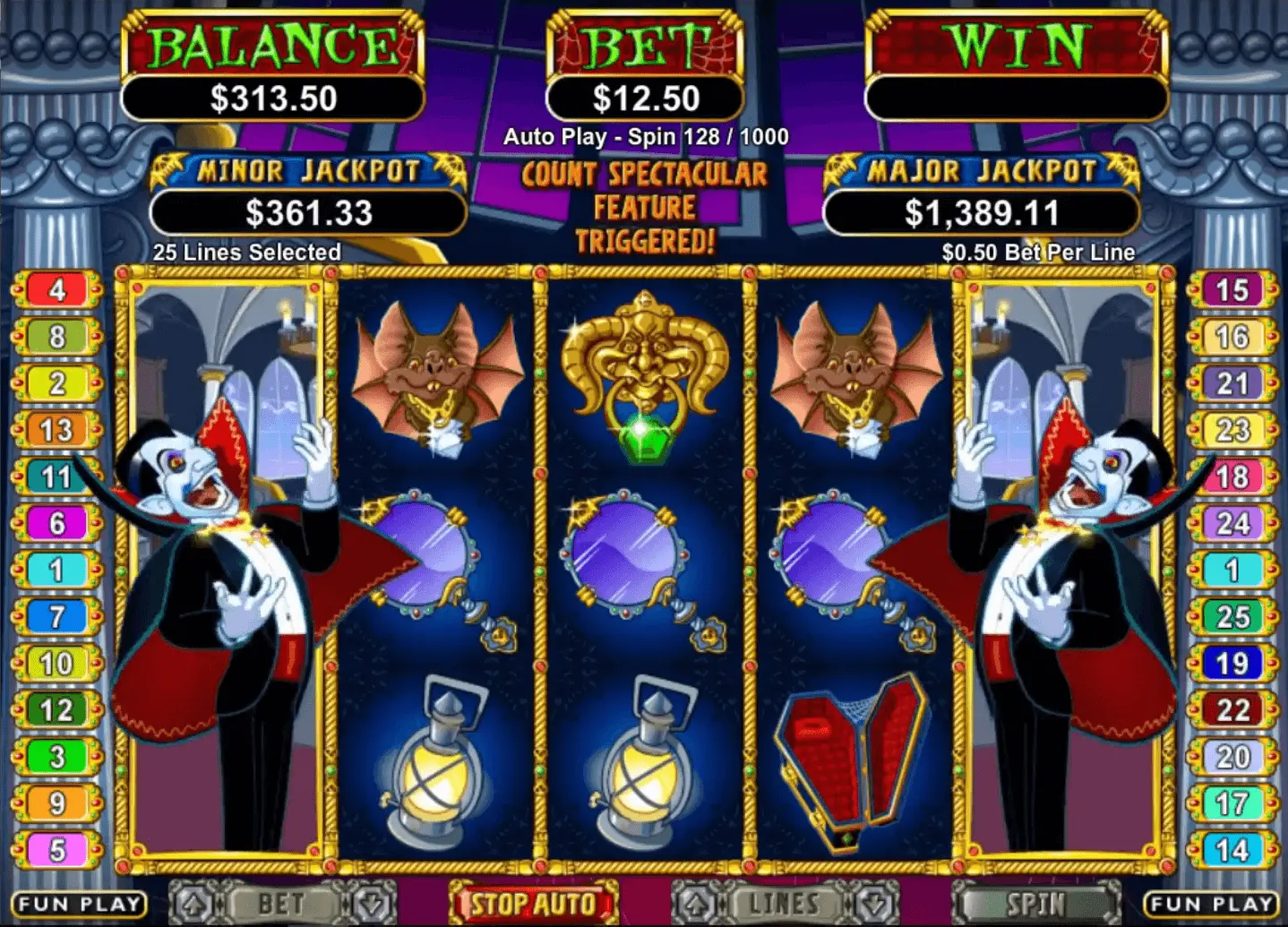 Enjoy the incredible world of vampires! Count Spectacular slot was launched by Realtime Gaming in 2010, it consists of 5 reels and 25 paylines. This is not their newest game, but it was so well made that even now it looks pretty and colorful, even though the thematic is gothic and meant to be creepy.