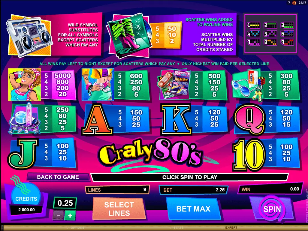 Look through our comprehensive Crazy 80’s slot review to figure out more about this enjoyable online game which belongs to Music, Movie, Mystery, Party, Paradise themed slots. Clearly, previously mentioned thematics for slot fans means heaps of great opportunities induced by all elements and actions connected to themes.