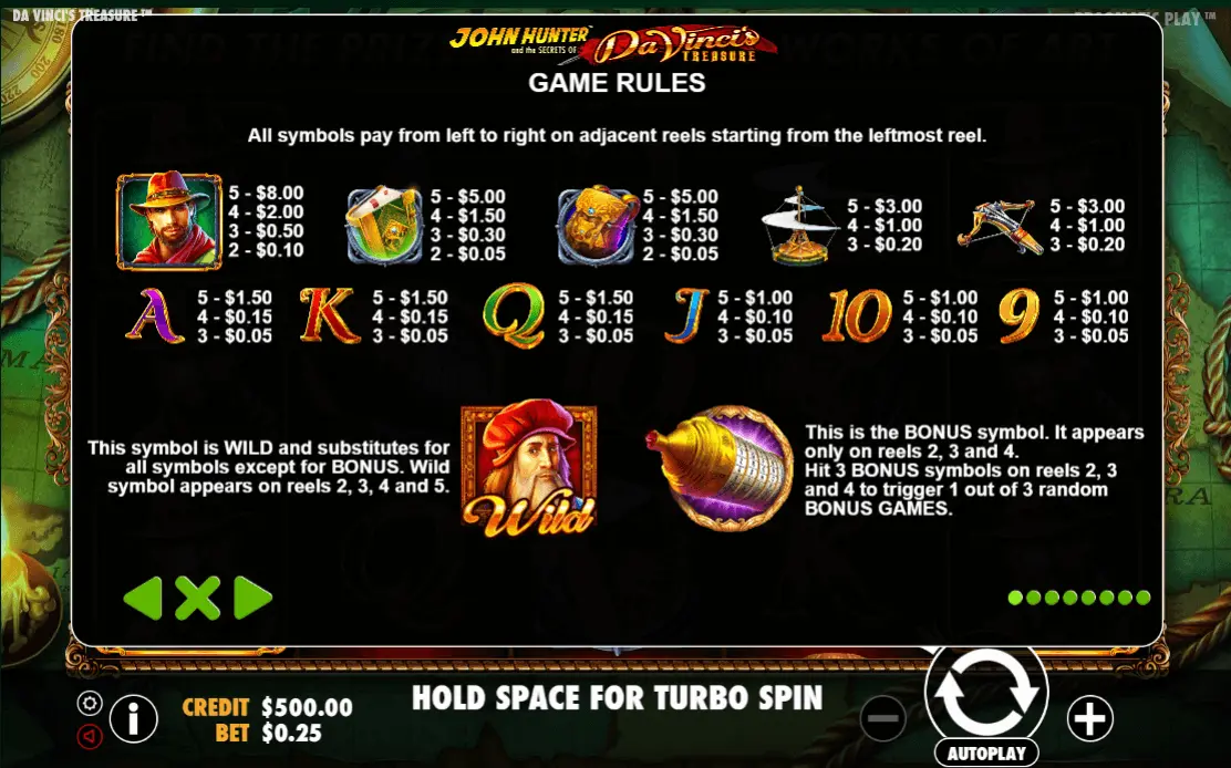 Da Vinci’s Treasure slot stands on Adventure thematic, however you will easily detect details from Journey, Fantasy thematics too. Clearly, if you like any of recent online slot machine themes – experience you get from discovering all features of this online slot machine will be simply remarkable.