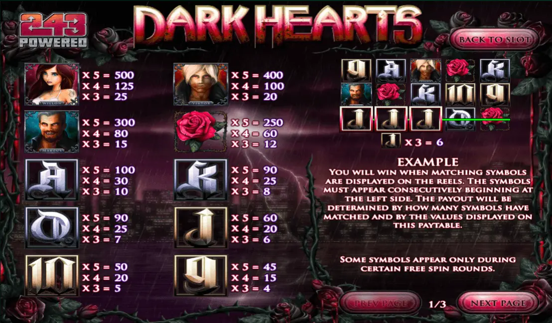 Symbols in Dark Hearts review complete the slow layout. The symbols in the game include three main characters, i.e. Viktor, Willow, and Marcus, alongside a Rose flower in the regular schemes. Other symbols including regular card symbols contribute to the low payout series.
