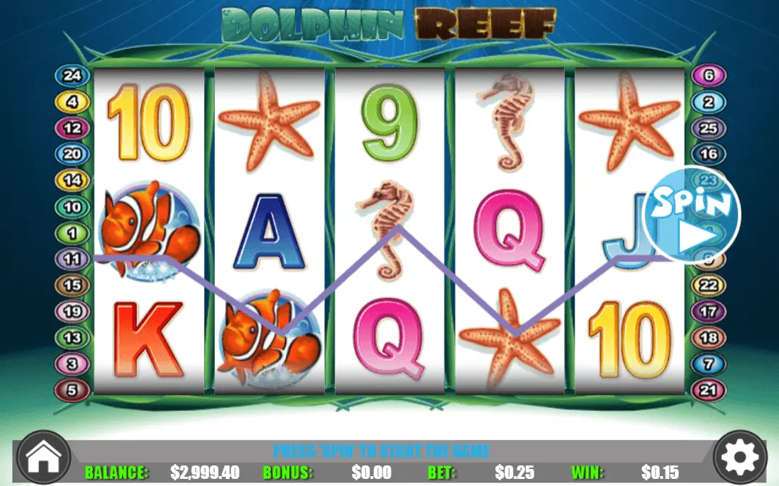 - The bonus features in this game are Free Spins. The way to the free spins is through dolphins. Landing the dolphin on reels 2 and 4 will give you the bonus. You will receive 5 Dolphin Reef free spins and a wild play.