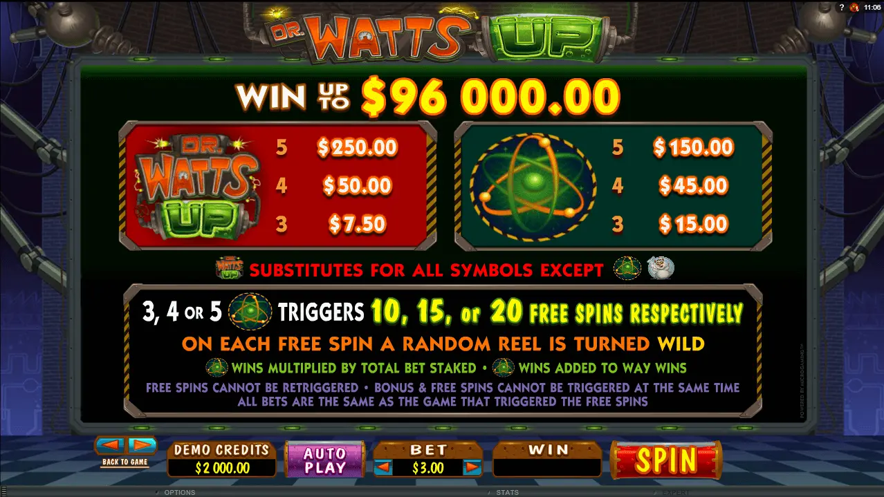 Dr Watts Up slot is a 5 reels as well as 243 paylines video online slot machine, made in 2013. Definitely, online game should be named as old and very trusted.