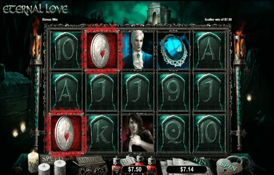 Eternal Love slot is one of the famous RTG powered love-fantasy game. The main theme of the game focuses on vampires and haunting backdrops of what is shown as evil during the Victorian era.