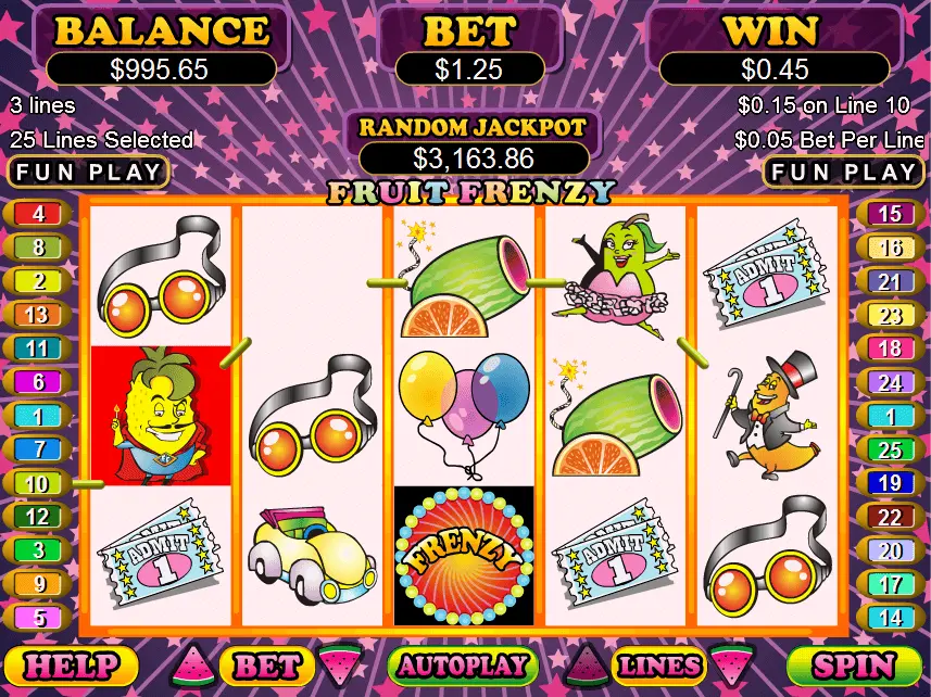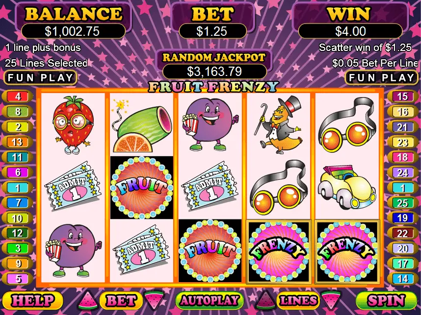 Bet between 0.01 and 5 coins per spin at the RTG’s 2011 game named Fruit Frenzy slot. Players can bet between 1 and 5 coins and get up to 6000 coins in this 5-reel 25-pay line game.
