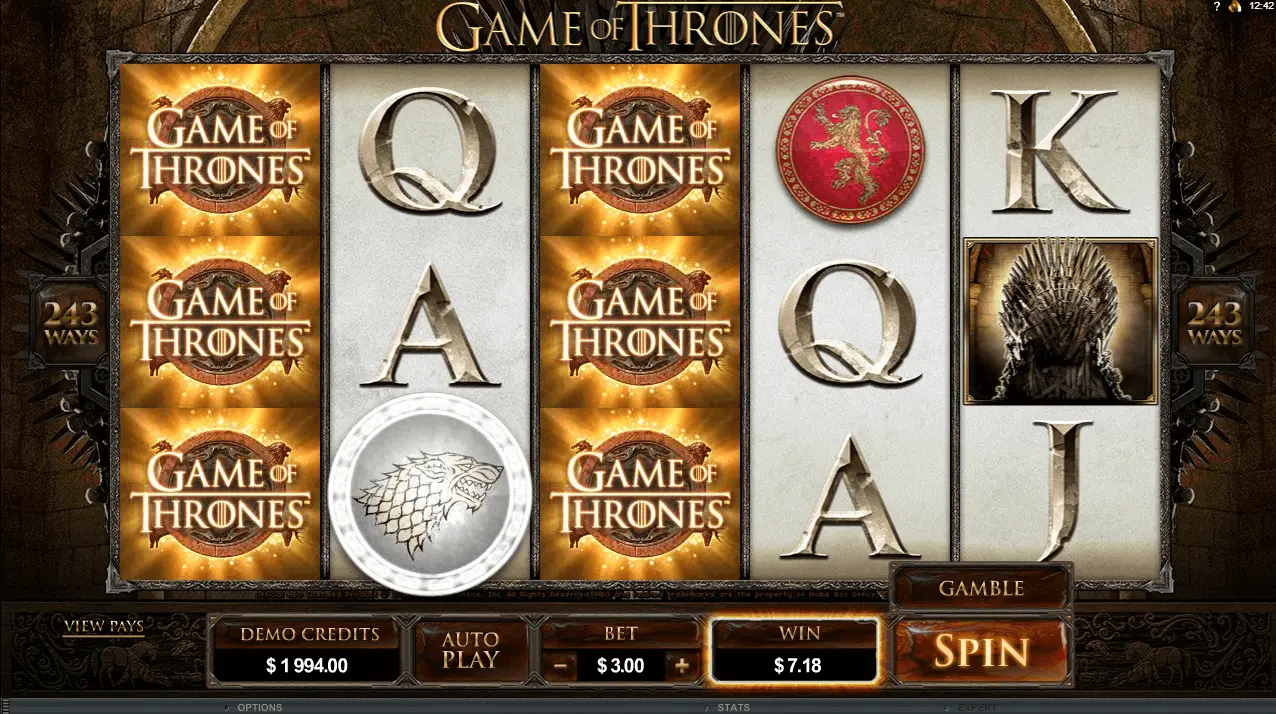 Run over broad Game Of Thrones 243 Ways slot review to learn more about this vivid casino game that displays Movie, TV, Battle, Fantasy, Adventure themed slots. Definitely, latter thematics for gamers means heaps of fun times produced by all details and celebrations related to themes.