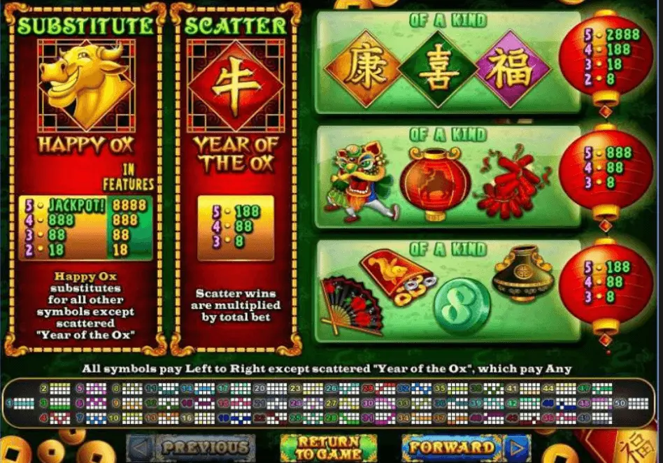 Happy Golden Ox Of Happiness slot has 5 reels and 50 pay-line progressive online slot machine, launched in 2016. Clearly, casino game should be called as new and modern.