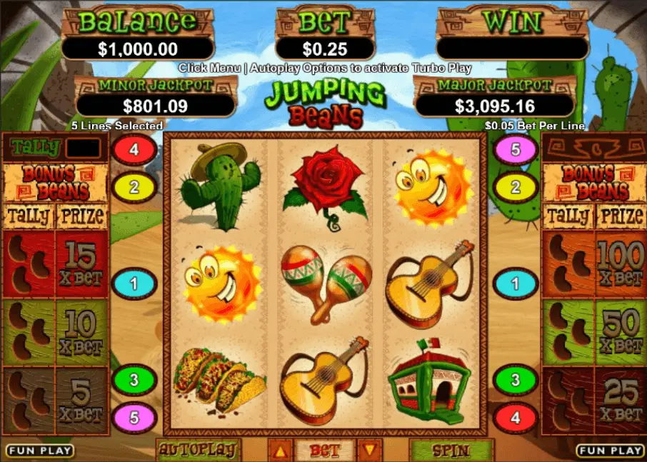 Jumping Beans slot has 3 reels and 5 pay-line progressive online slot, created in 2013. Certainly, game can be labeled as well-established.