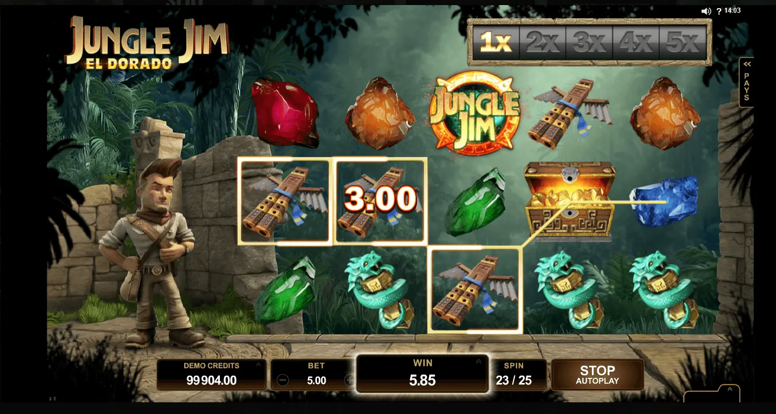 Jungle Jim El Dorado slot features a large variety of colorful symbols that include precious stones emeralds, rubies, sapphires, topazes and also treasure chests and sculptures. You can see the protagonist situated alongside the reels and equipped with modern gadgets. When you land a successful spin, the symbols will be replaced for others, which gives a great chance to form a new combo. This process keeps repeating as long as you hit wins.