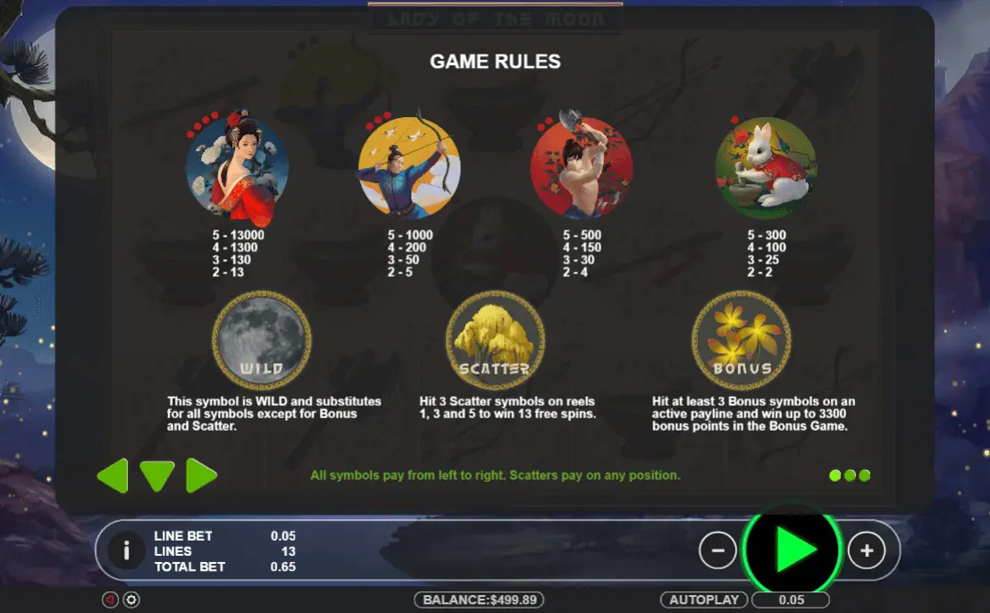 - Scatters: The scatter symbol in the game is an image of a flower, which appears across the main reel. The purpose of scattering is to activate Lady of the Moon free spins in the main game, and gives out 13 fixed free spins while appearing on reels 1, 3, and 5 respectively.