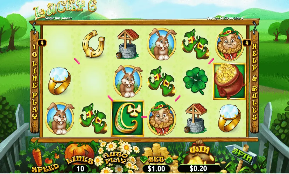 From Lucky 6 review, you can see the symbols include Irish-themed icons such as Leprechaun, clover leaf, wishing well and green boots. You can even see other symbols such as toadstool, horseshoe, bunny, and diamond ring.