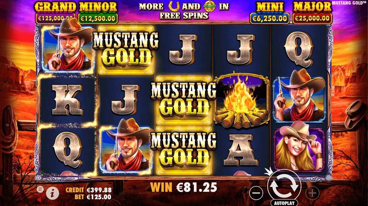 Mustang Gold slot is based on Animal theme, but nevertheless you will easily find components from Adventure, Gold, Wild, Wild West topics as well. Certainly, if you enjoy any of previously mentioned online slot machine thematics – moments of exploring all features of this online slot machine will be simply remarkable.
