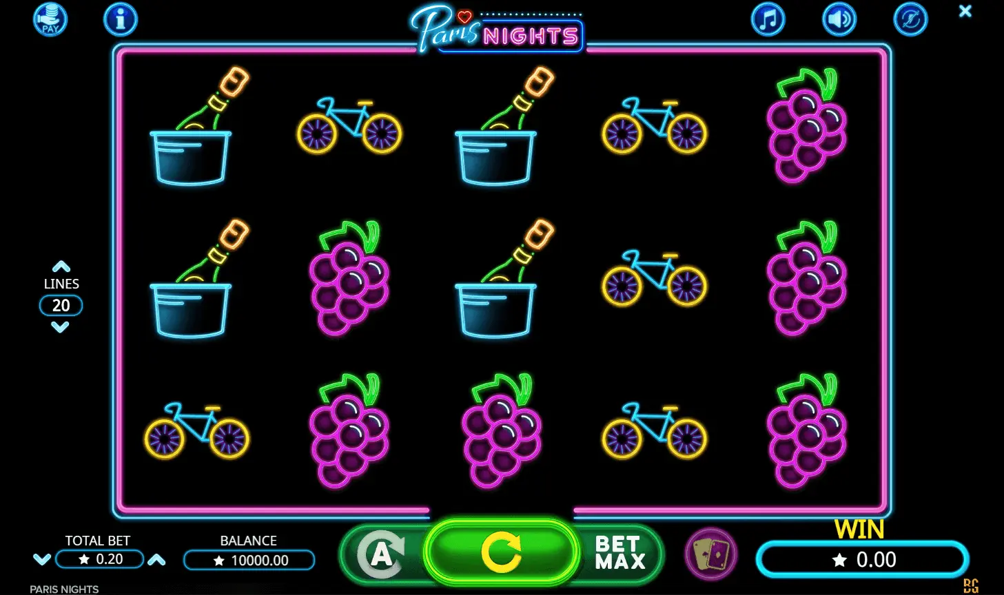Paris nights slot features neon symbols which are represented by the Eifel Tower, bottle of champagne, red grapes, 7s of different colors and bicycles against a dark and plain background. Stacked symbols will definitely benefit your winnings. The Eifel Tower is the wild.