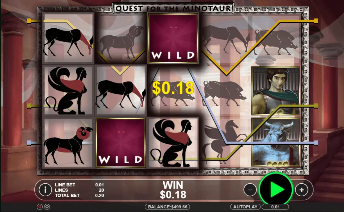 Octopus gaming powers Quest for the Minotaur slot game with 5 reels and 20 paylines. The RTP of this game is 92.40%. Greek Mythology is a theme for this game with title as Quest of Minotaur- half bull and half human.