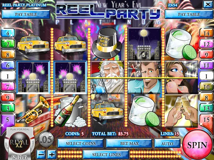 Rival Gaming’s 2010 Reel Party Platinum slot is all about the spirited New Year’s Eve party. There are stars and celebrities not to mention social butterflies who spark up the party in this 5-reel 15-pay line game. The RTP is 96% for a jackpot of 5000 coins if you bet max 0.01 coins to 1 coin, bet per spin ranges from 1 to 5 coins.