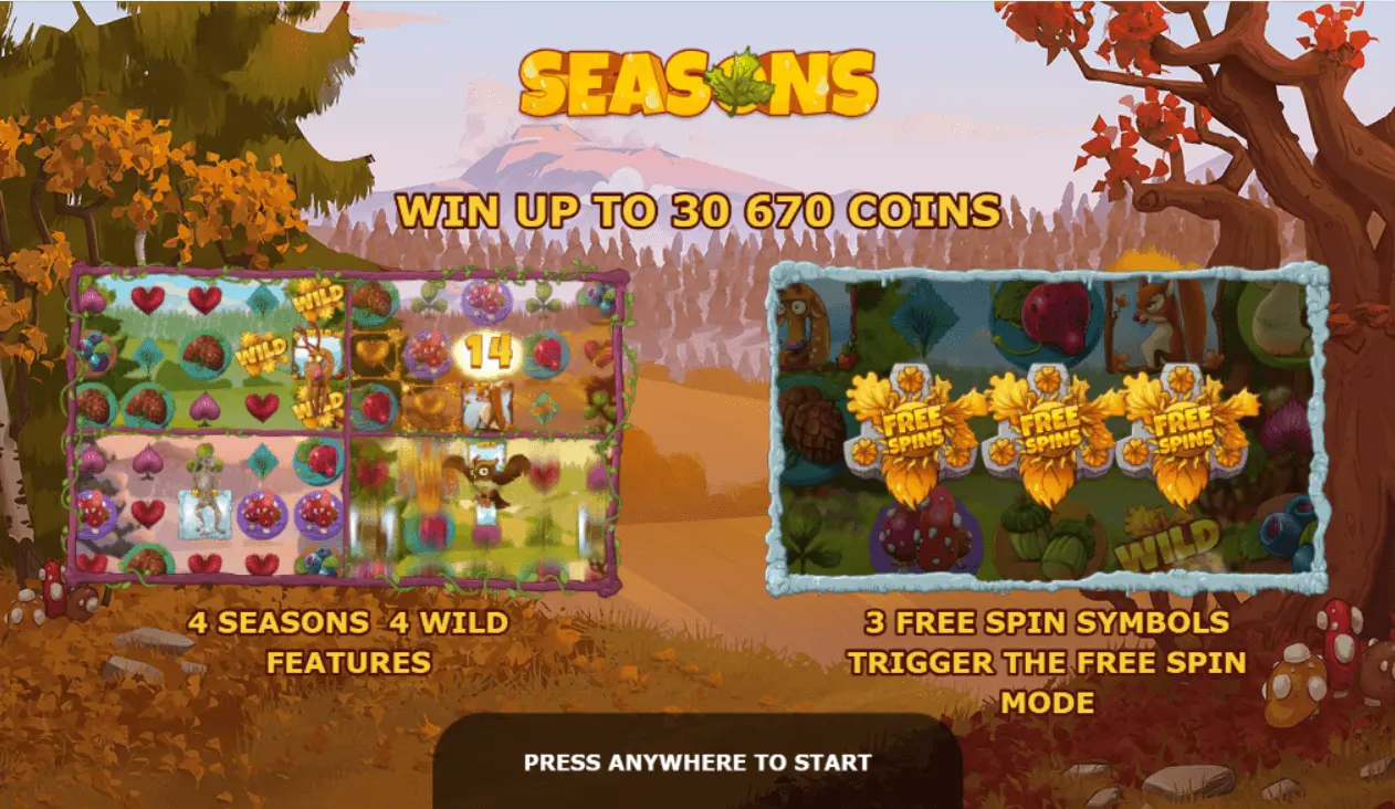 Seasons slot is a perfect online slot for players who likes nature fulfilled of beautiful colours and funny animals. Play with 50 Free spins welcome bonus.🦌
