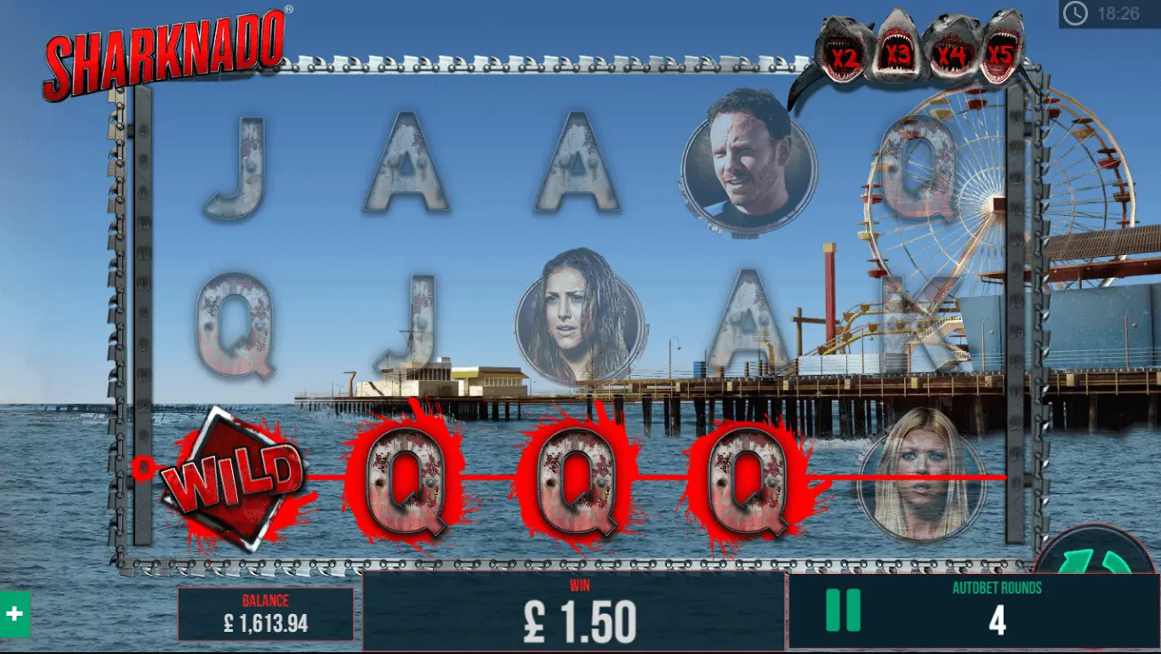 If you see three or more motor saw symbols, it will activate the Sharknado free spins feature. For three, four, and five scatter symbols, you will get up to 10, 15 and 20 free spins respectively.
