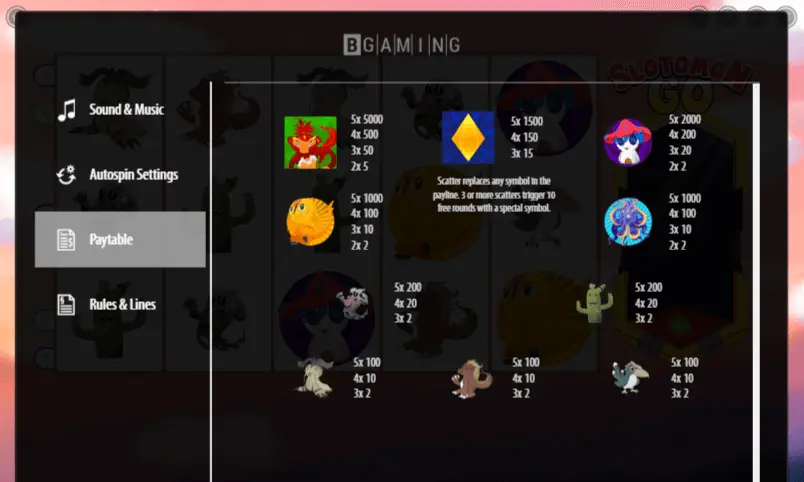 Slotomon Go slot grounded on Animal theme, though you will be able to notice aspects of Wild, Battle, Asian, Fantasy, TV, Cartoon thematics too. Undoubtedly, if you are keen on some of latter online slot themes – experience from discovering all features of this slot machine will be really outstanding.