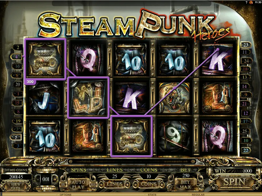 Released in the year 2012, Steam Punk Heroes contains 25 paylines and 5-reel structure. The game has a coin range from 0.01 to 0.2 coins. The RTP is 95.88%, which triggers wins on every instance.