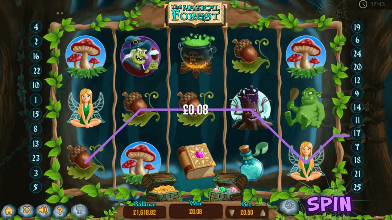 Acorn, bubbling cauldron, a book of spells and a trio of toadstools are the lower-value symbols that award the player up to 50, 75 coins for the first two and 100x for the other two. The other symbols include fairy, witch, troll, animated tree, a blue potion, and some mushrooms. Two red ghosts circling each other signify a wild symbol.