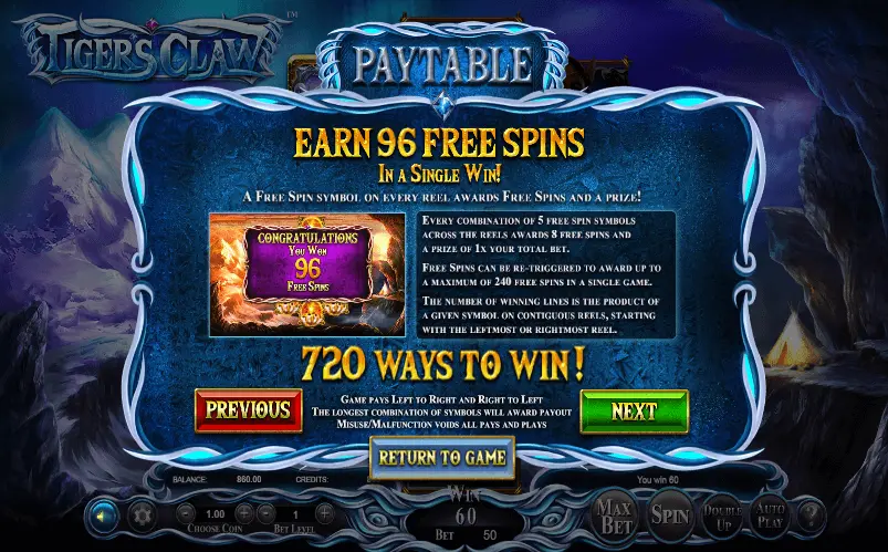 Tigers Claw slot, launched in 2018, presents players with a visually stunning and modern gaming experience. With its 5 reels and 720 paylines, this online slot ensures that every spin is filled with excitement and potential wins.