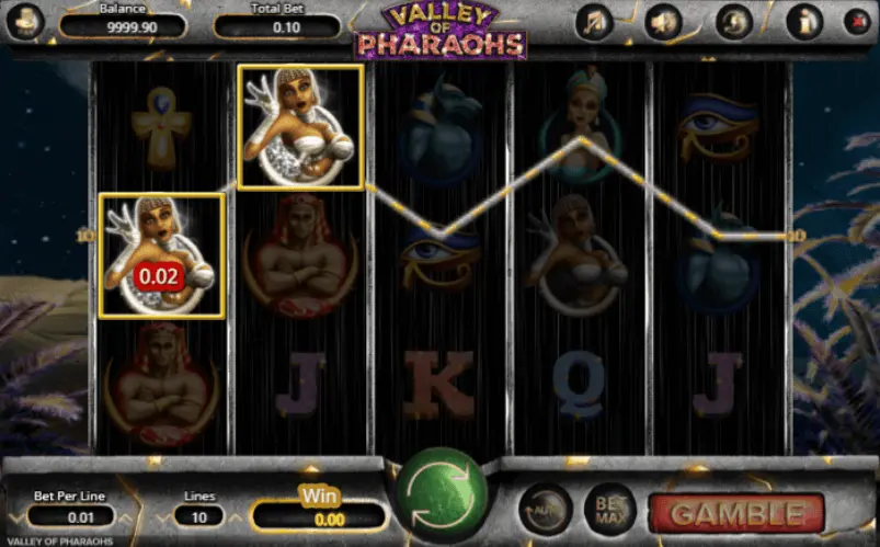 Valley of Pharaohs slot stands on Queen topic, though you will be able to notice aspects of Pharaoh, Ancient, Egypt themes too. Undoubtedly, if you love some of recent slot topics – experience from discovering all features of this online slot will be completely outstanding.