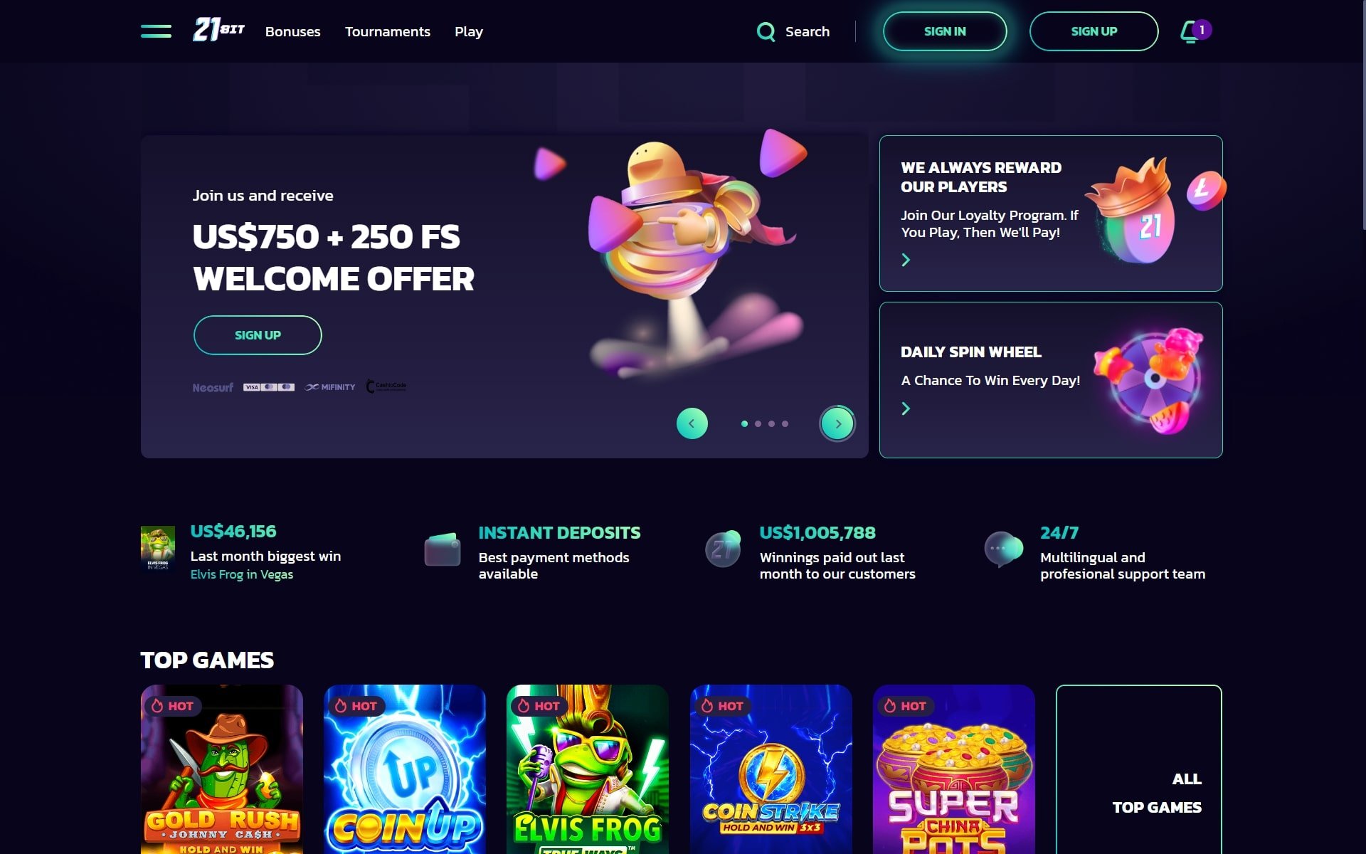 21Bit Casino launched in 2022 on the SOFTSWISS platform, pairing a crypto-friendly cashier with familiar card and voucher options. A large multi-provider lobby leans into high-volatility slots, RNG tables, and live dealers.