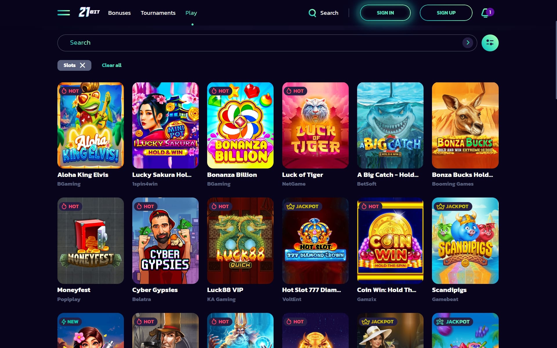 21Bit’s lobby spans pokies (slots), RNG table games, jackpots, instant-win, crash titles, and a full live casino. You’re not just getting volume—you’re getting variety from 60+ studios, so you can switch between feature-buy slots, Megaways, classics, crash games, and show-style live tables without leaving the brand.