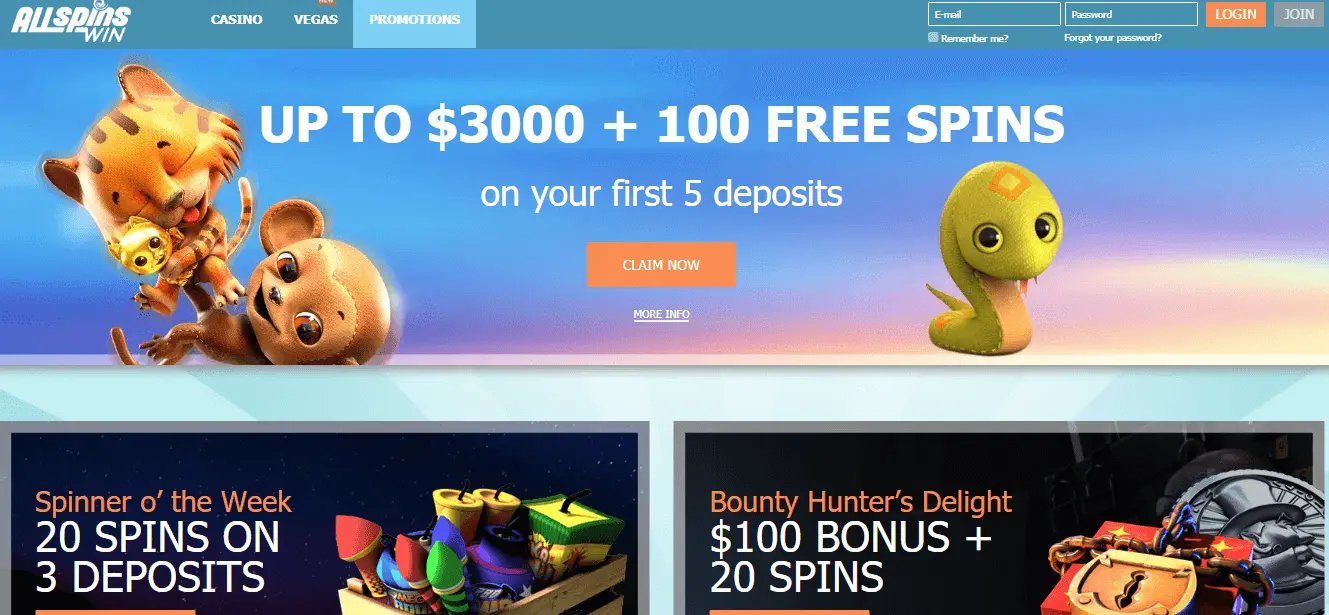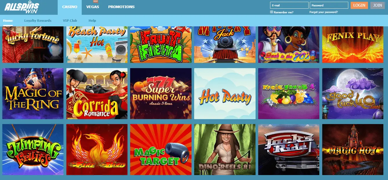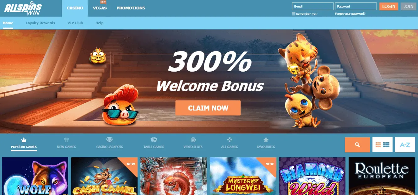 All Spins Win Casino is a sister casino site for ROO Casino and Wager Beat Casino. Main characteristics are similar or even the same: great welcome bonus, fast withdrawals with E-Wallets, modern gaming experience and exclusive VIP and Loyalty programs.