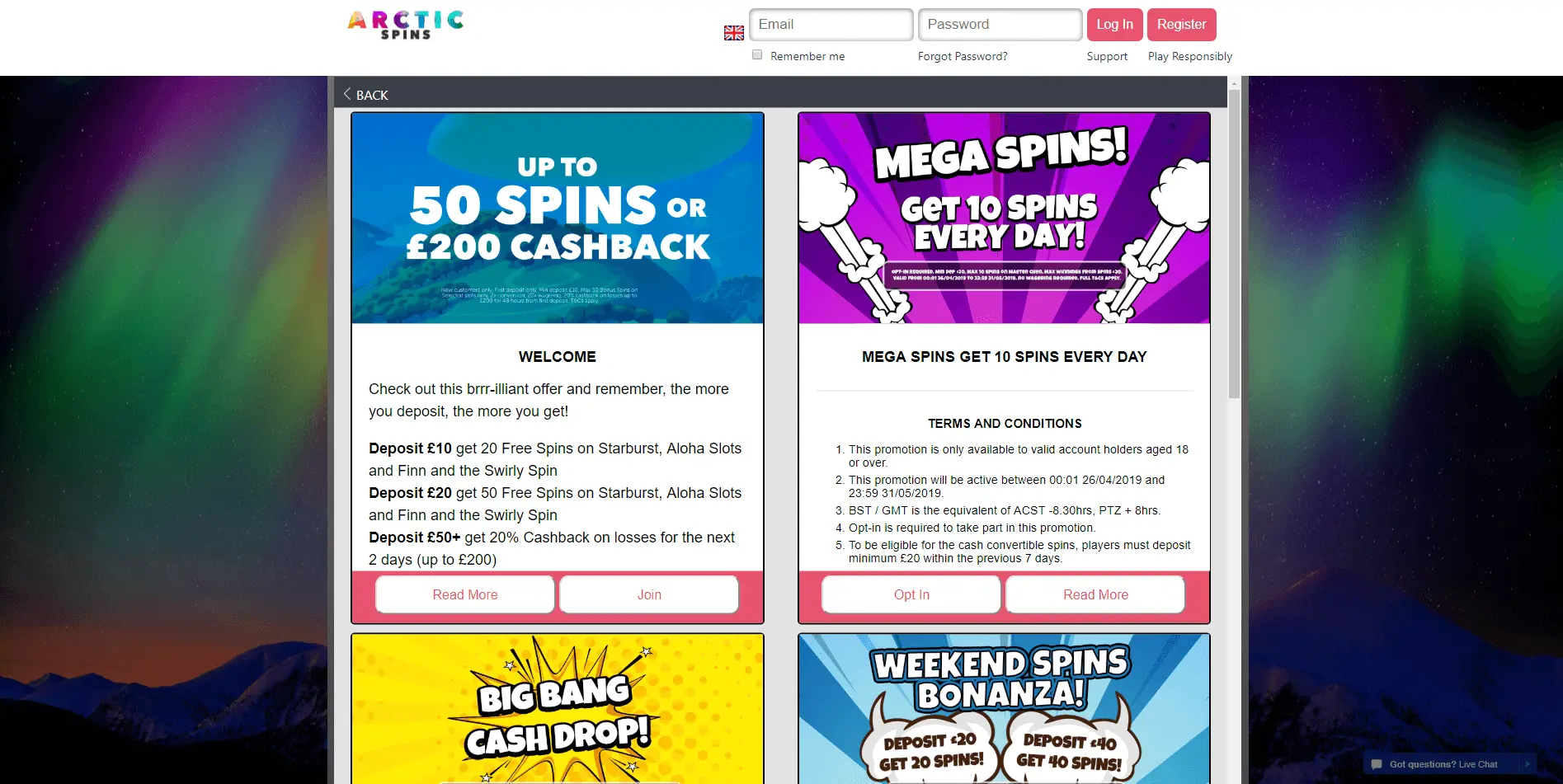 Arctic Spins Casino focuses on serving well players from high-standard UK, NORDIC, Canada markets. However, players from other countries are welcomed here too. Nice slot library will satisfy fans of any top provider's games. Grab Free spins promo and enjoy playing at Arctic Spins Casino!