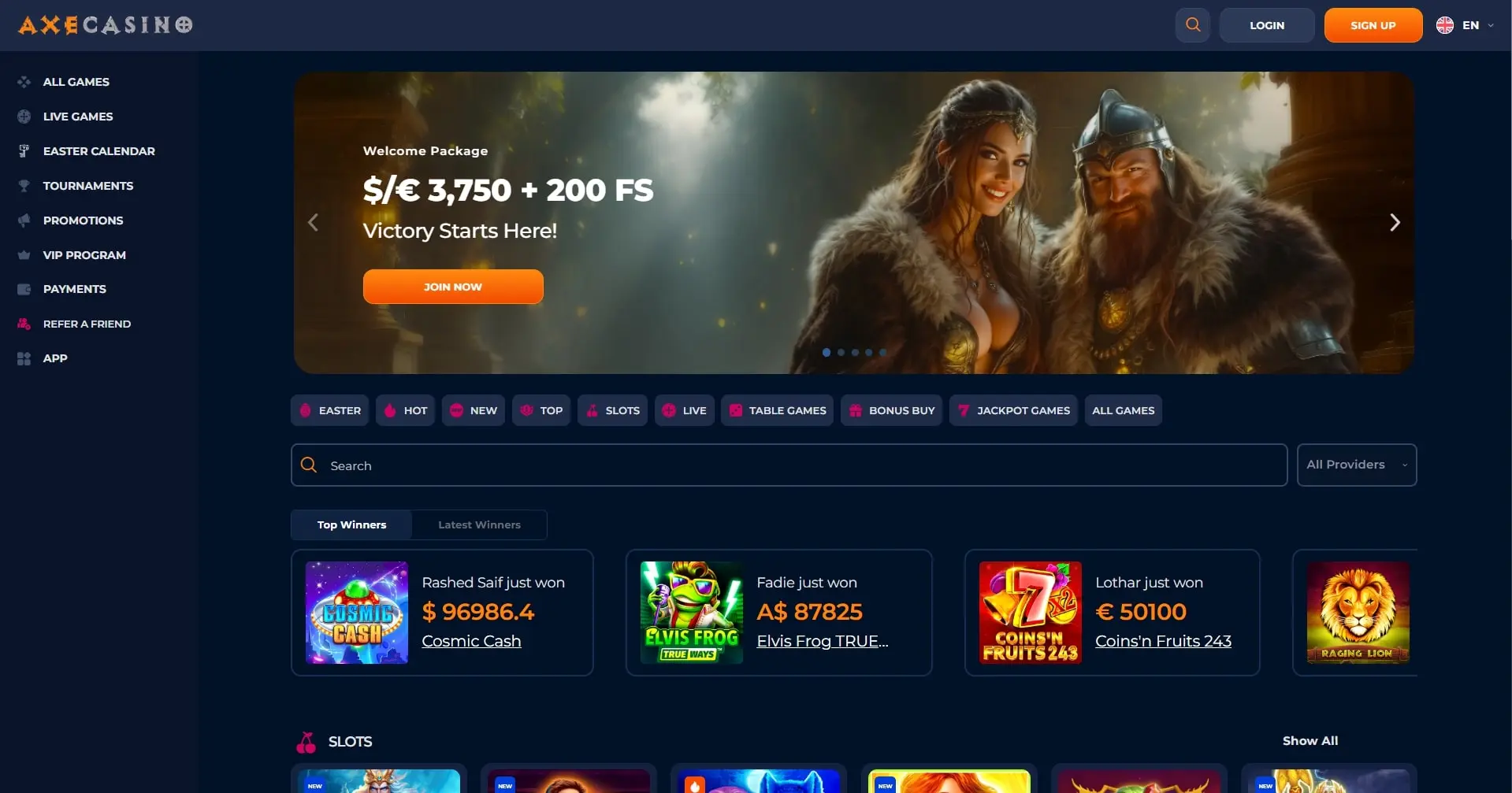 In just a short time, Axe Casino has emerged as a well-rounded online gambling destination. The game library is extensive, covering everything from top-tier slots to immersive live dealer experiences. The attractive welcome offer of up to $5,625 + 200 free spins sets the stage for a rewarding journey, and the VIP program gives regulars plenty to look forward to.