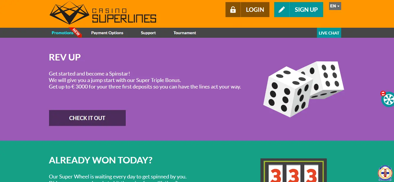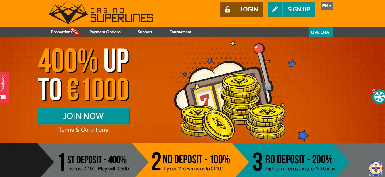 Casino Superlines is one of innovative new online casino sites who offers great gaming library as well as valuable ongoing bonuses. Tournaments at Casino Superlines also deserves separate mention. Moreover, casino provides many different payment methods, languages and support channels. 🎰