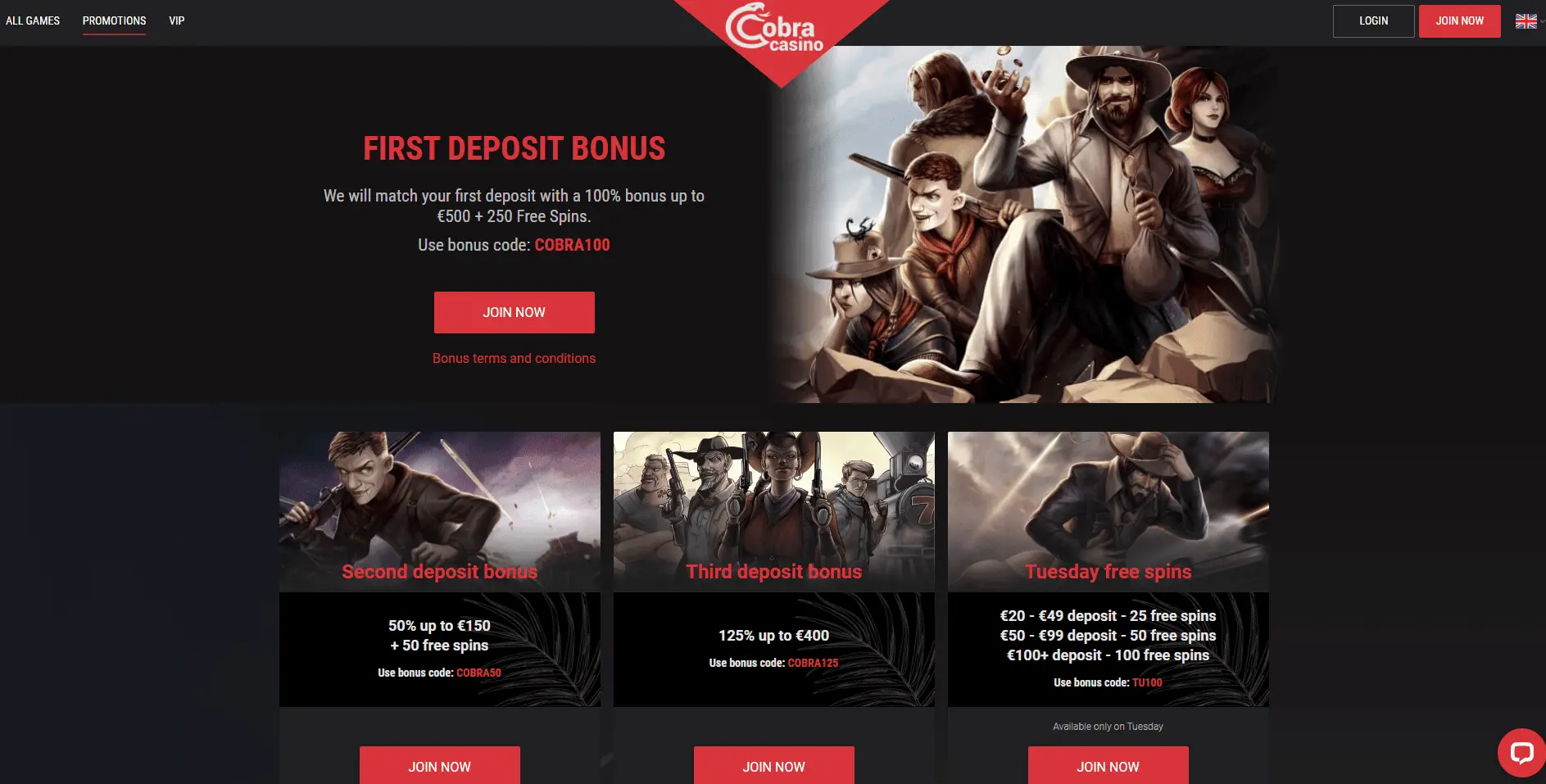 Cobra Casino offers a generous three-tier welcome package to new players, which can be claimed using specific bonus codes in the bonus section. When making your first deposit, you’ll receive a 100% bonus of up to €500 and 250 free spins.