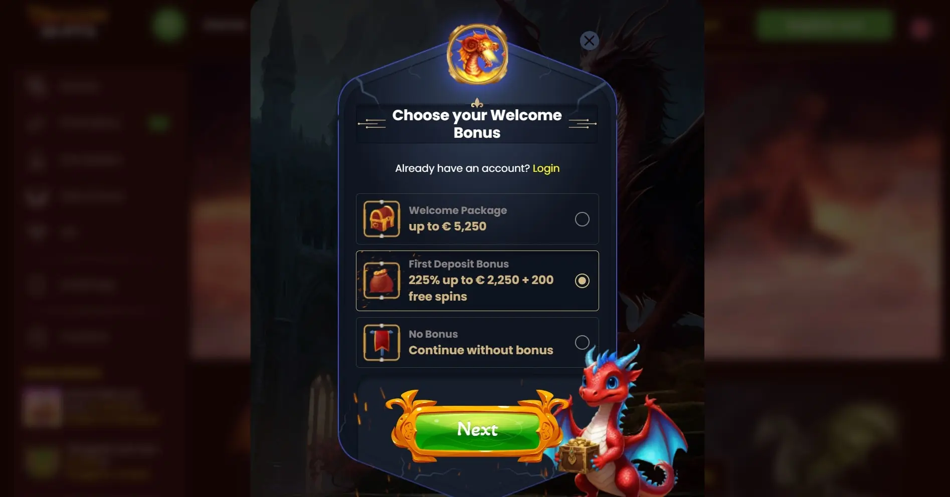 DragonSlots offers a range of enticing promotions, starting with a comprehensive four-part welcome package. Below is a detailed table outlining the main bonus offers: