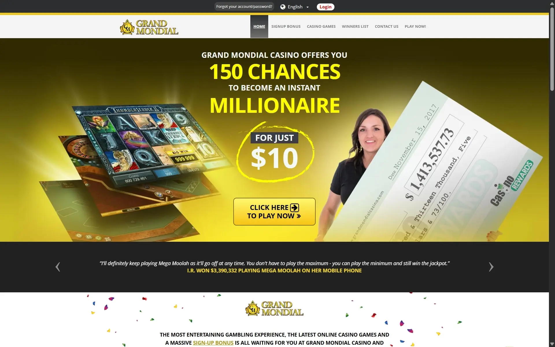 Launched in 2006, Grand Mondial flips a $10 deposit into 150 Mega Moolah spins and a 100 % reload, all inside a 1 400+ Microgaming lobby with fast Interac cash-outs.