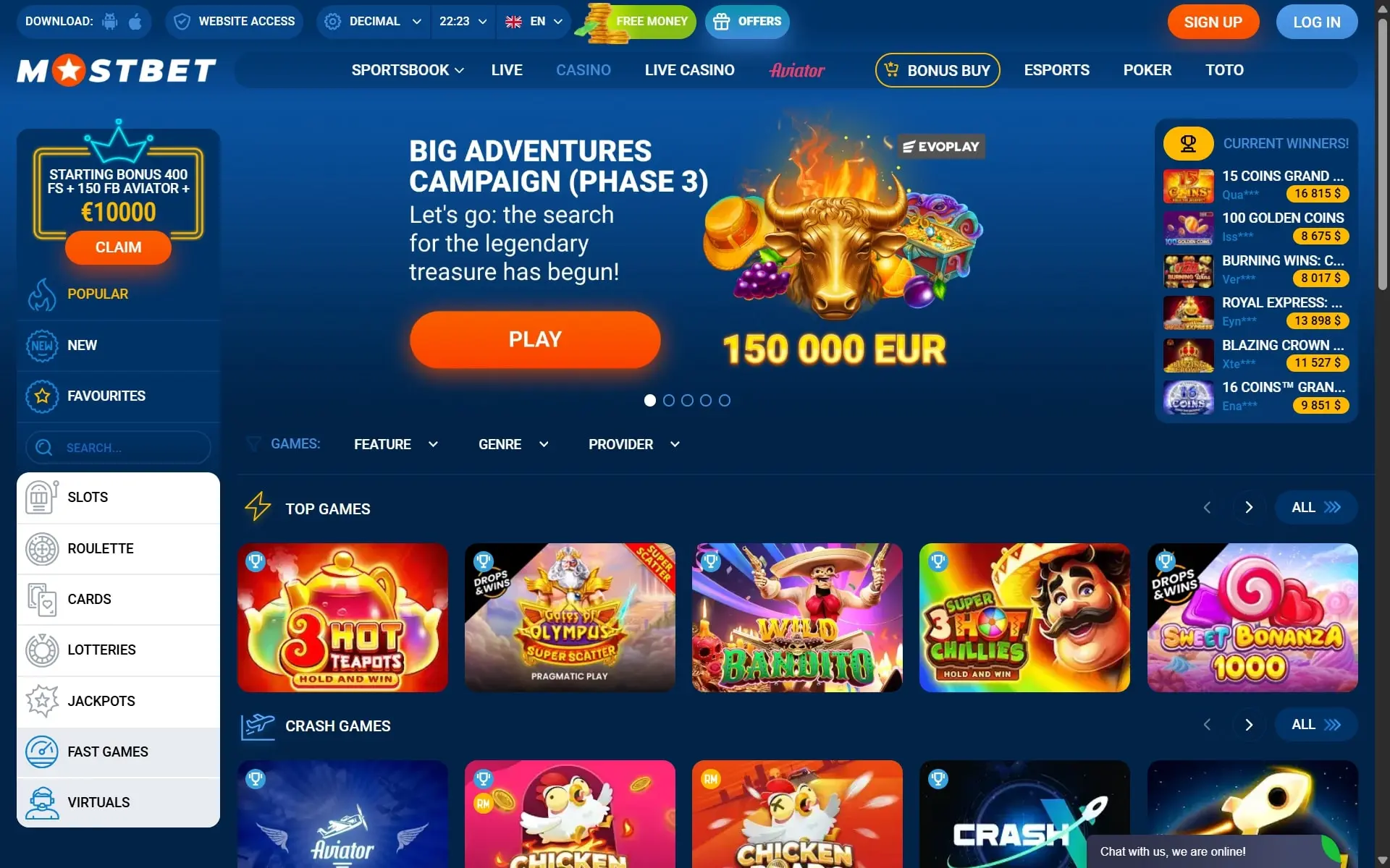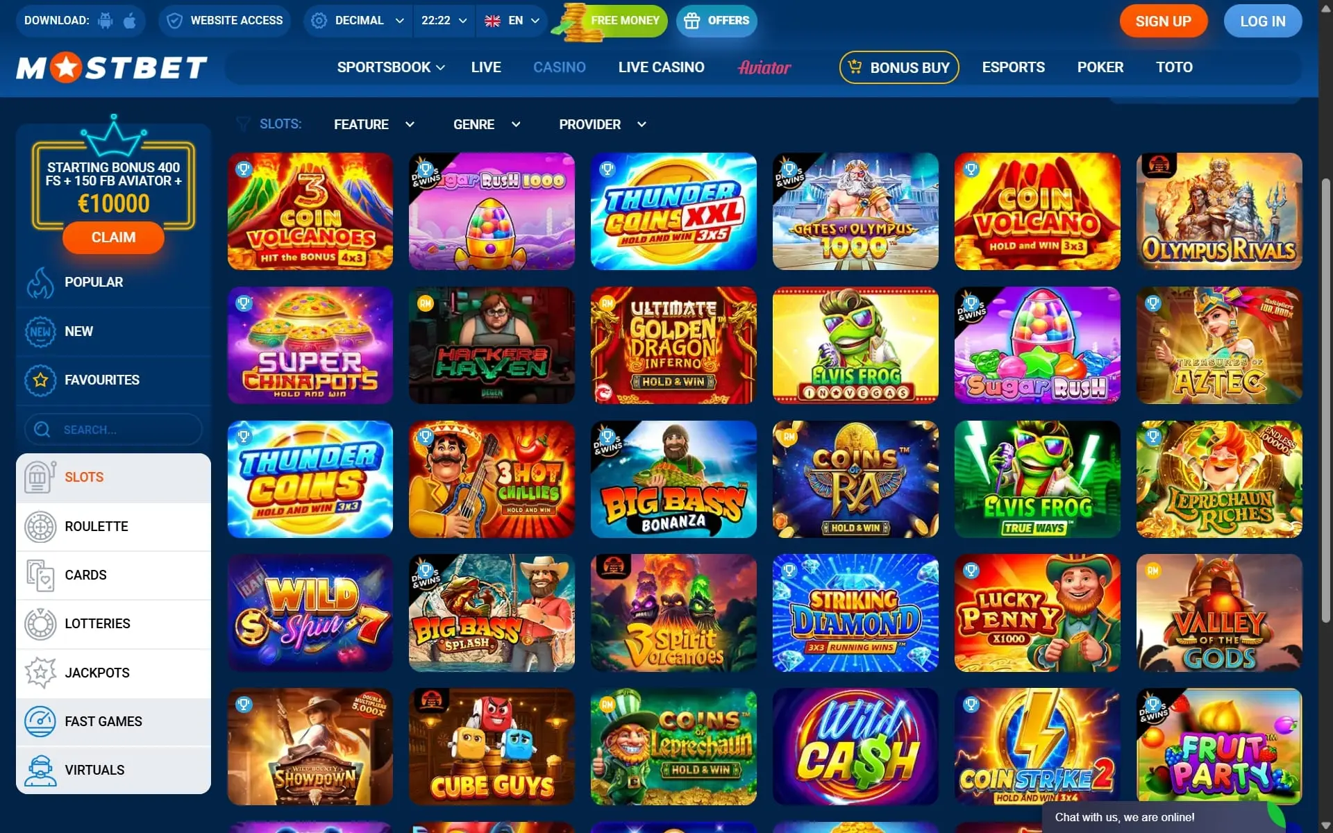 - Software provider: 100HP Gaming, 7777 Gaming, Amigo Gaming, Aviatrix, Betsoft, CG Games, Dreamplay, Evoplay, Formula Spin, GamomatGames, GMW, iMoon, Kalamba, Leap Gaming, Max Win Gaming, Mostbet, OriginalGames, Play'n GO, Pragmatic Play, ReelPlay, 1Spin4Win, 7Mojos, Amusnet, Beefee, Bigpot, Clawbuster, Edict, Fazi, Fugaso, Gamzix, GoldenRace, InOutGames, Kendoo, Live22, Max-Sports, NetGaming, Pascal Gaming, Playson, Push Gaming, Relax Gaming, 1x2 Gaming, AGTSoftware, Apollo, Beon, BlueHorn, CQ9, ElaGames, FBM DS, Galaxsys, GClub, Hacksaw Gaming, IronDog, Kiron, LiveGames, MegaFair, NGM, PeterAndSons, Playtech, Raw, Retro Gaming, 3 Oaks, Altente, Arrowsege, BetGames, BoomingGames, Darwin, Endorphina, Felix Gaming, Games Global, Genii, HeroByte, Jackpot, LagioGaming, Mancala Gaming, MobiLots, OnlyPlay, PGSoft, PopiPlay, Red Tiger Gaming, Rival Gaming, 4ThePlayer, Amarix, AvatarUX, BetRadarVS, Capecod, Digitain Virtual Sports, Enjoy, FintechFuel, GamingCorps, GGames, Iconic21Live, KAGaming, Lambda Gaming, Mascot Gaming, Monobet, Orbital Gaming, Phoenix7, Pragmatic Play, RedWinX, Ruby Play