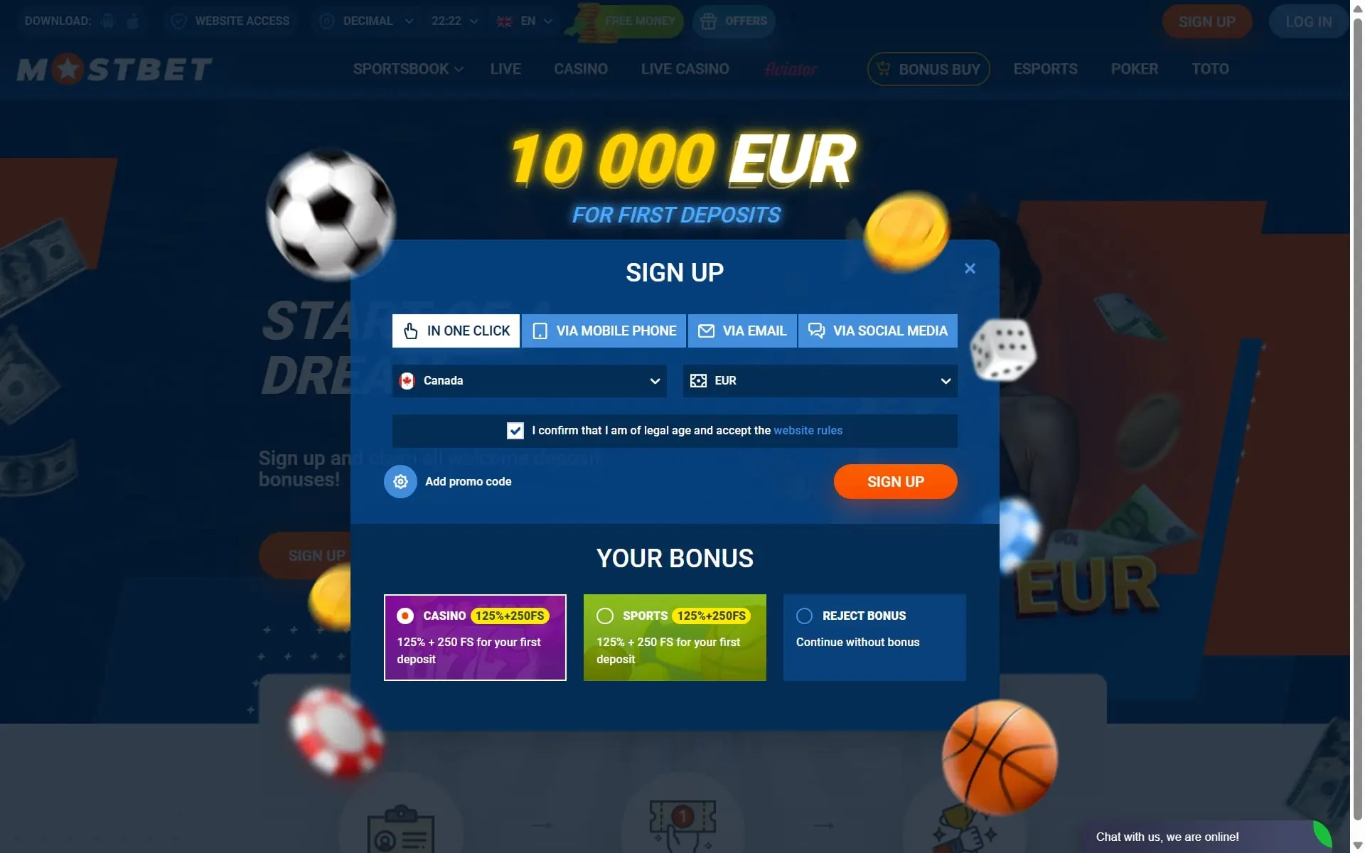 Welcome Bonus (5-tier): 125% up to €10,000 + 250 Free Spins.