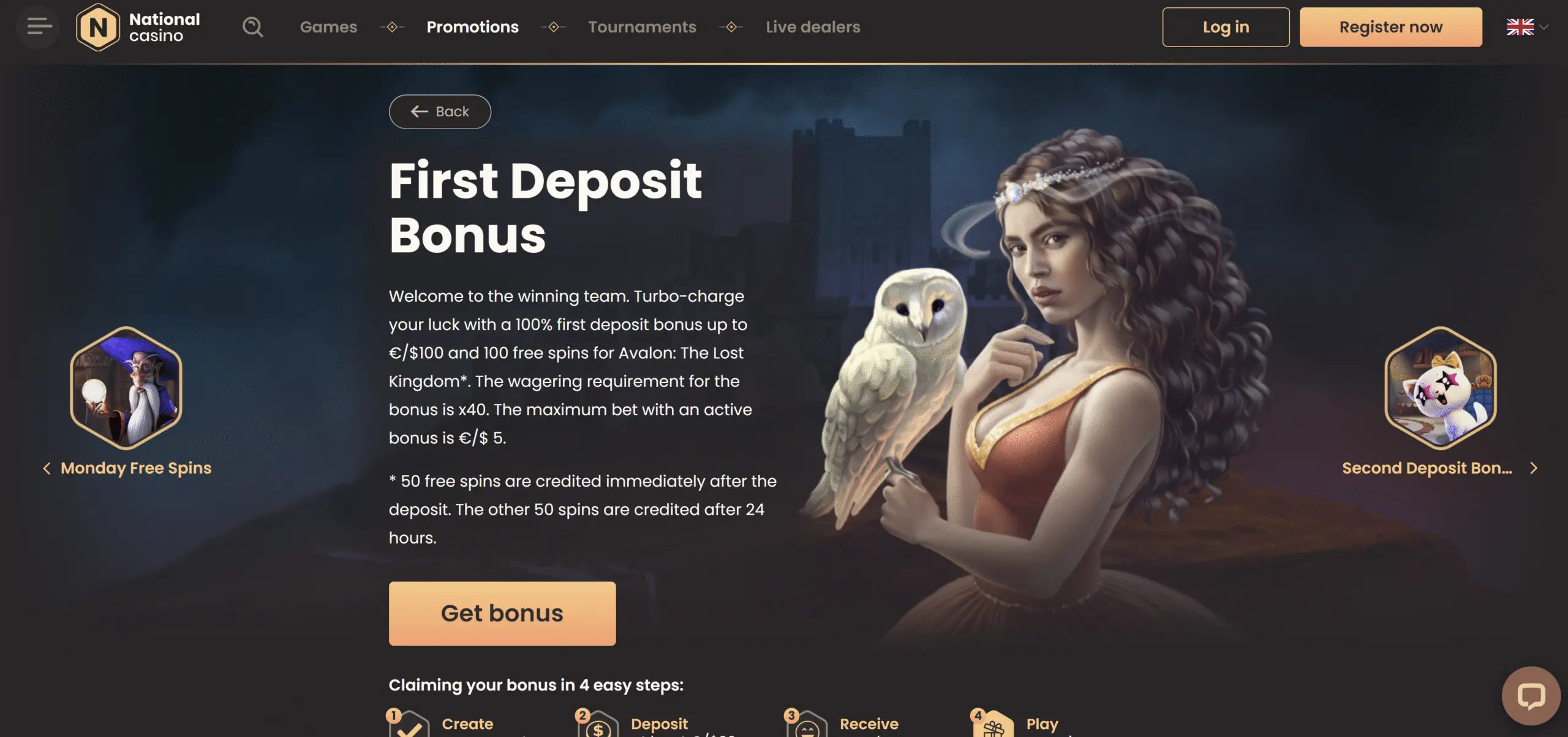 In addition to the bonus money, this offer comes with 100 free spins. You must play the Book of Cats slot to redeem the free spins with this bonus.