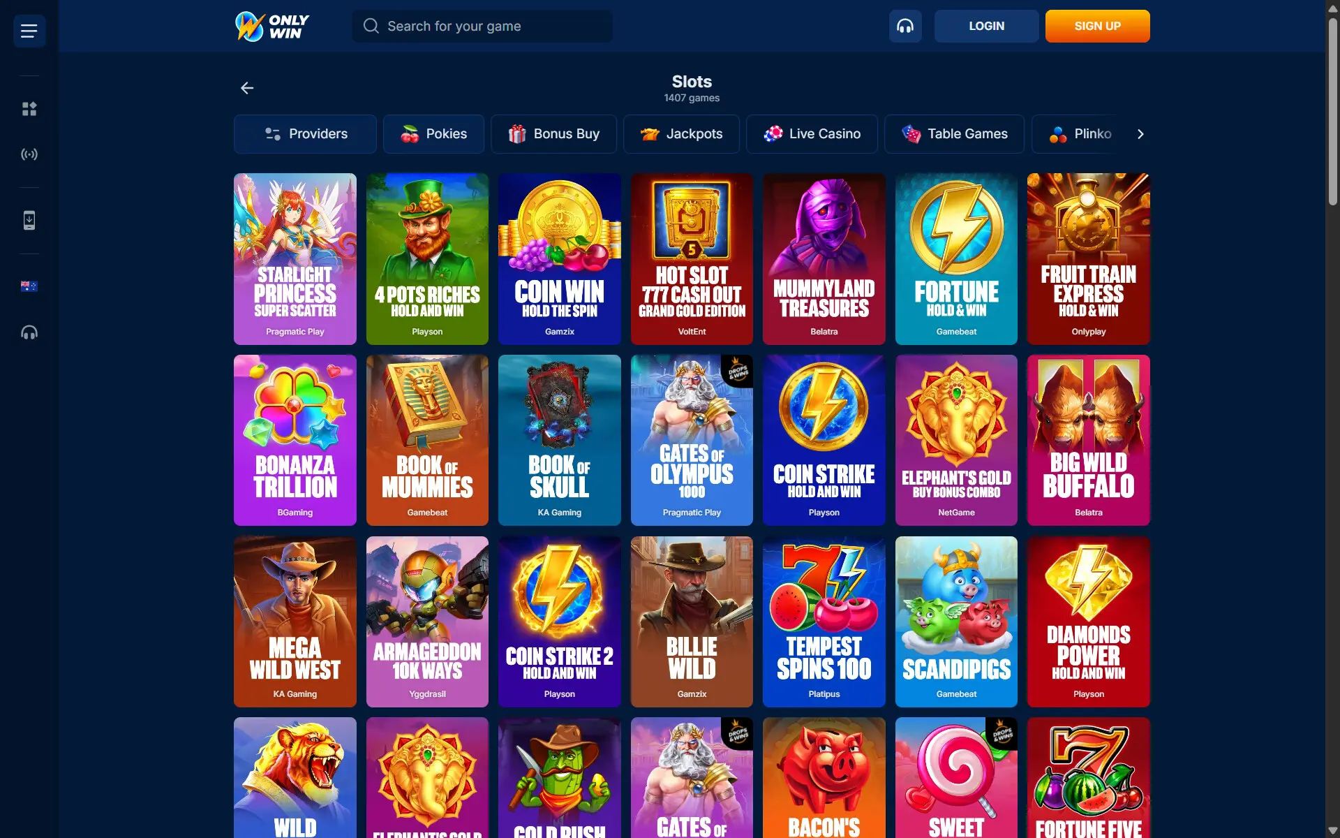 - Software provider: OneTouch Games, NetEnt, Ezugi, Pocket Games Soft, Blueprint Gaming, Habanero, Genii, Super Spade Games, GameArt, Caleta Gaming, Betsoft, Tangente, Kalamba Games, TrueLab Games, Asia Gaming, Spade Gaming, Hacksaw Gaming, BetGames, Revolver Gaming, BGaming, Evoplay, Fugaso, Amusnet (Former EGT Interactive), Spribe, Swintt, Red Rake Gaming, Gamzix, Turbo Games, Yolted, Onlyplay, Avatar UX, SmartSoft Gaming, Air Dice, Parlay, Golden Rock Studios, Zillion Games, Elk Studios, G Games, Eurasian Gaming, Rogue, 3 Oaks Gaming, Lady Luck Games, 1x2Games, Darwin Gaming, VIVO Gaming, Fantasma Games, Peter & Sons, Oryx Gaming, Atomic Slot Lab, CandleBets, Slammer Studios, Indigo Magic, Elbet