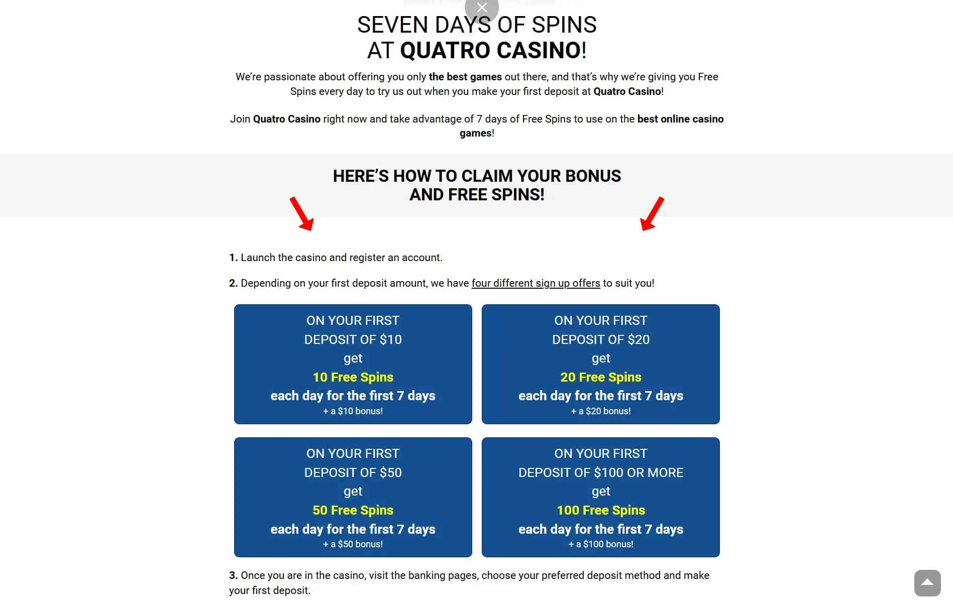 The welcome bonus at Quatro Casino gives up to 700 free spins. Your first deposit bonus depends on how much you add. A $10 deposit gets a $10 bonus plus 70 spins, while $100 brings a $100 bonus plus 700 spins. Spins are given daily for up to seven days.
