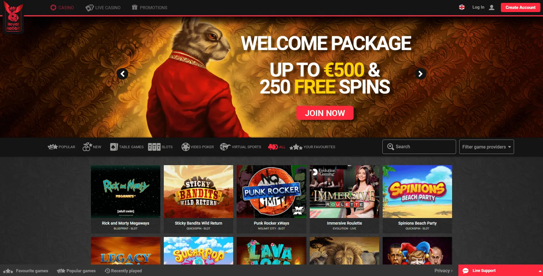 Royal Rabbit Casino is equipped with diverse games like Roulette, Jackpots, Video slots, Blackjack, Bingo, Video Poker, Baccarat, and many live casino games. One can also choose from the games like Vikings Go Berzerk, Sweet Bonaza, Wolf Gold, Sticky Bandits Wild Return, Mustang Gold, and many more trending among the players.